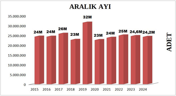 2024 yılı Aralık ayında 24.266.456 adet kitap üretimi gerçekleşti. Önceki yılın aynı ayındaki adet 24.655.322 olarak kayıtlara geçmişti. Aralık ayında kitap üretimi %1,5 oranında küçülme gösterdi.