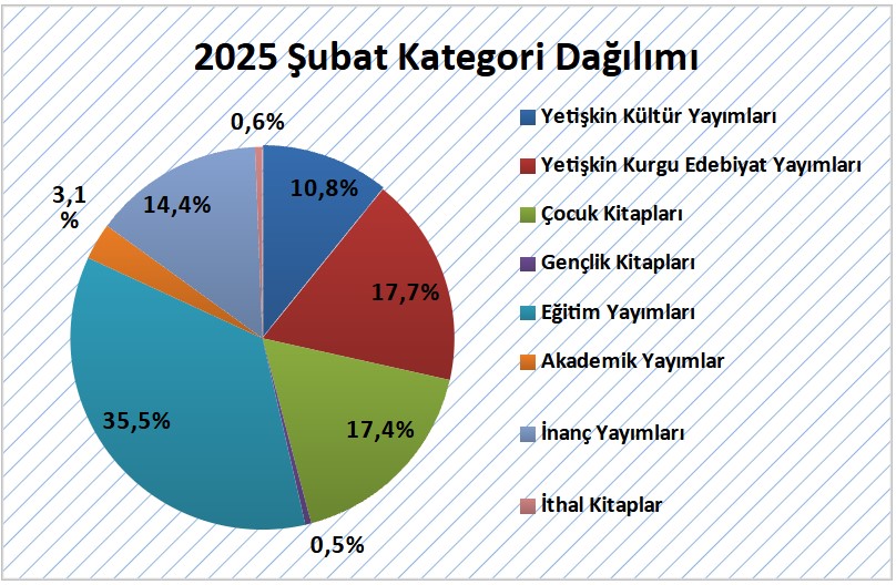 2025 yılı Şubat ayında yayımcılarımızın almış olduğu bandrollerin kategori dağılımına göre; yayımlanan kitapların yaklaşık %10,8’ini Yetişkin Kültür Yayımları, %17,7’sini Yetişkin Kurgu Edebiyat Yayımları, %17,4’ünü Çocuk Kitapları, %0,5’ini Gençlik Kitapları, %14,4’’ünü İnanç Yayımları, %3,1’ini Akademik Yayımlar, %0,6’sını İthal kitaplar ve %35,5’ini Eğitim Yayımları oluşturdu.